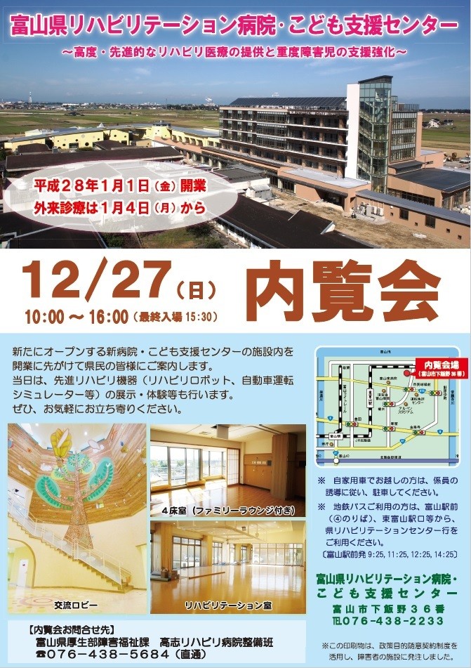 富山県が整備を進めてきた富山県高志リハビリテーション病院改築及び子ども支援センターが来年から開業しますが、それに先立ち内覧会が開催されます。